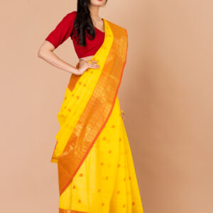 Yellow & Red floral design pure cotton Dhakai Jamdani Saree.