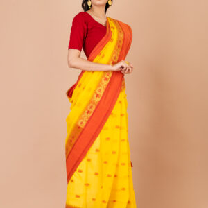 Bengali, Cotton, Culture and Tradition, NEW ARRIVALs, Occasion, Pujo/Puja, Red, Saree, Tant Sarees, yellow