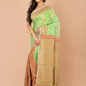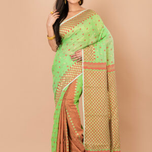Green & Red ethnics motifs pure cotton Dhakai Jamdani Saree.